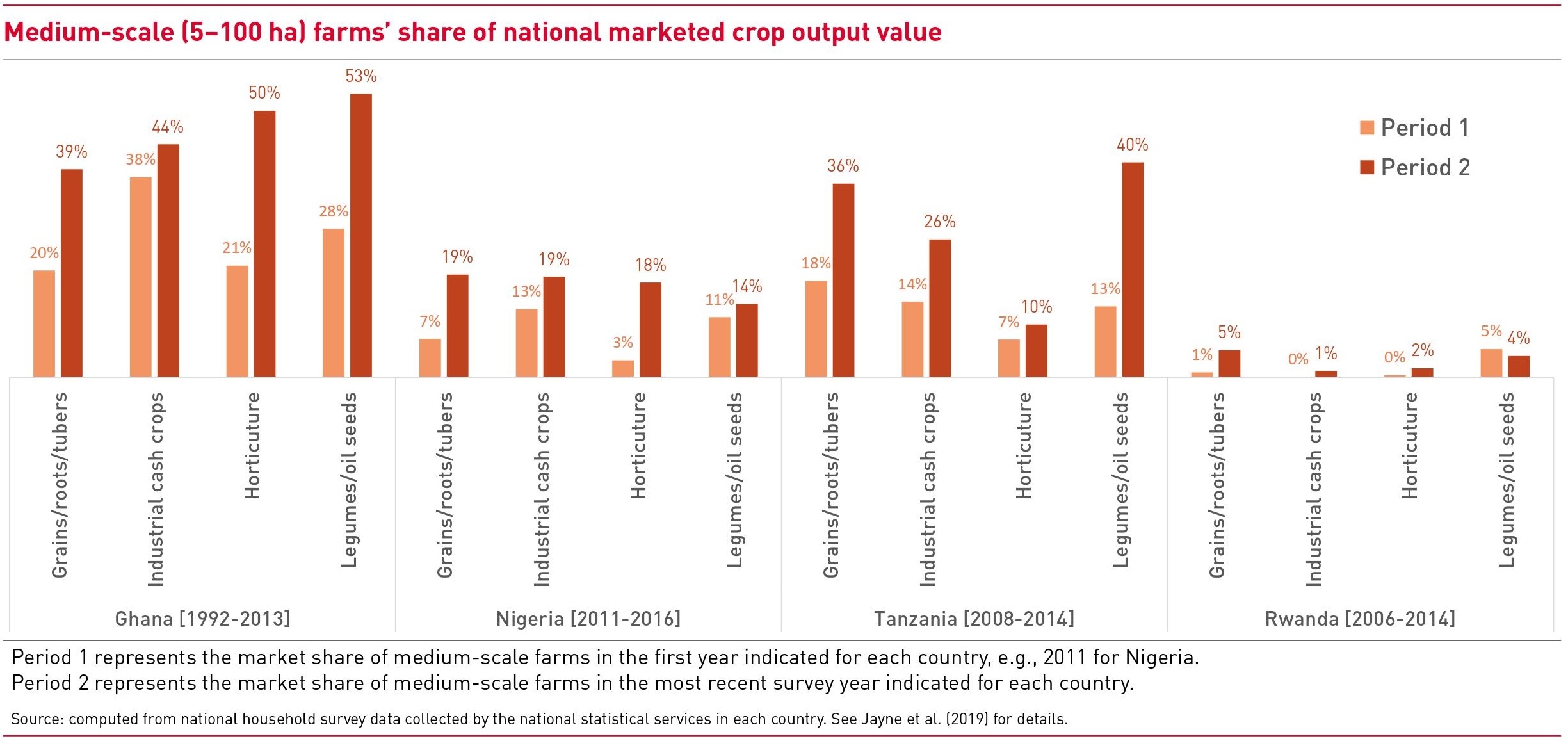Das Wachstum der afrikanischen Landwirtschaft wurde durch eine steigende Zahl an gewerblich und unternehmerisch orientierten, relativ gut gebildeten afrikanischen Landwirten beschleunigt (Jayne et al., 2019). In Teilen der Region südlich der Sahara vollziehen sich tiefgreifende Veränderungen bei der Verteilung des landwirtschaftlichen Grundbesitzes. „Mittelgroße“ Betriebe mit fünf bis 100 Hektar Land machen heute in vielen afrikanischen Staaten mindestens 30 Prozent der bewirtschafteten Landesfläche aus. Und dieser Anteil steigt in Staaten, in denen noch viel Land ungenutzt ist (Jayne et al., 2016). In einem Zeitraum von etwa zehn Jahren nach der Jahrtausendwende ist der Anteil mittelgroßer landwirtschaftlicher Betriebe am Wert der im eigenen Land vermarkteten Pflanzenerzeugnisse in Sambia von 23 auf 42 Prozent gestiegen. In Tansania wurde ein Anstieg von 17 auf 36 Prozent verzeichnet, in Nigeria stieg der Anteil von 7 auf 18 Prozent (siehe folgende Abbildung). Der Anteil mittelgroßer Betriebe am Wertzuwachs der nationalen Pflanzenerzeugnisse im selben Zeitraum in Ghana, Tansania und Sambia betrug in allen drei Staaten mindestens 45 Prozent (Jayne et al., 2019). Paradox scheint, dass diese Gruppe afrikanischer Landwirte seit dem Jahr 2000 flächenmäßig weit mehr Land erworben hat als ausländische Investoren (Jayne et al., 2014a). Diese Entwicklung ist nur scheinbar überraschend, rückblickend mag sie schlicht logisch sein. Folge des dramatischen Anstiegs der weltweiten Lebensmittelpreise nach 2007 waren große ausländische Investitionen in Landwirtschaftsflächen in Afrika. Weshalb hätten afrikanische Investorinnen und Investoren nicht dasselbe tun sollen?