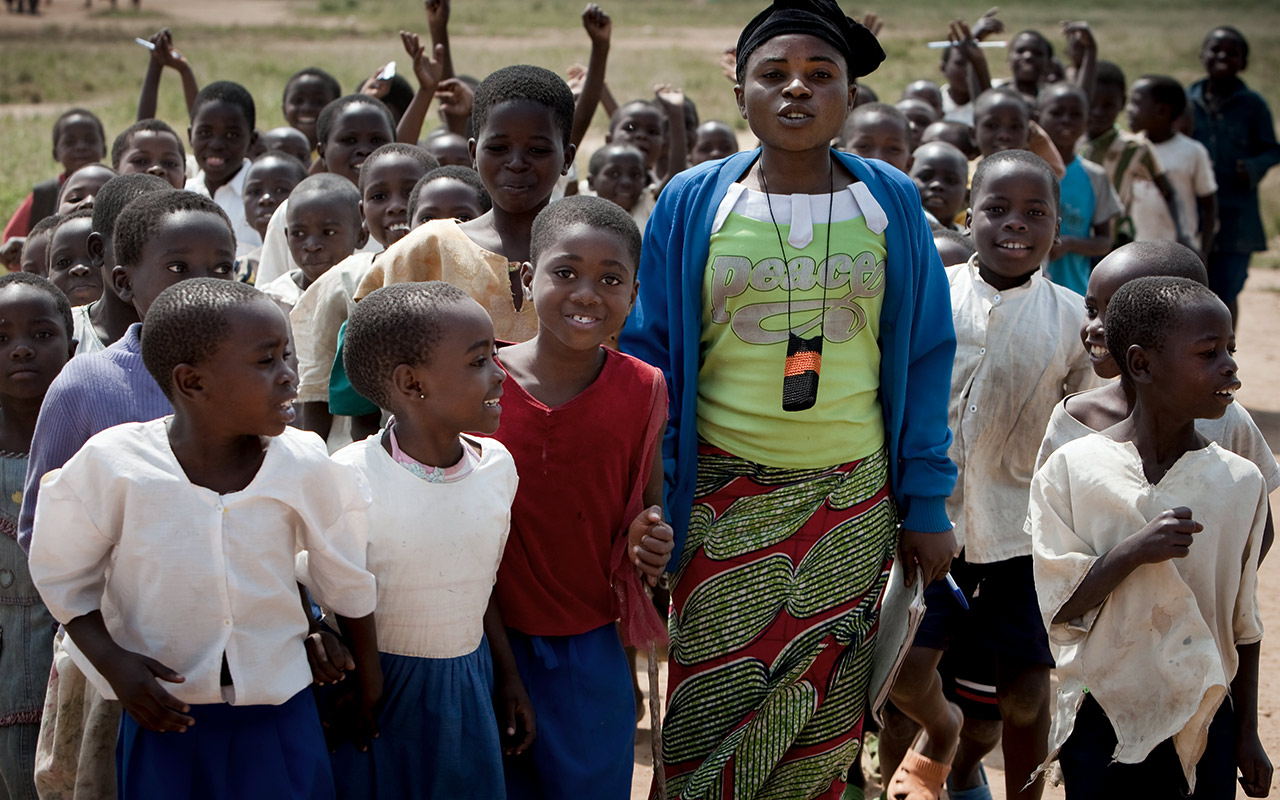 Schulkinder und ihre Lehrerin auf einem Schulhof der 40.000 Einwohnerstadt Kaina, Ost-Kongo. Foto: Christoph Püschner/Diakonie Katastrophenhilfe