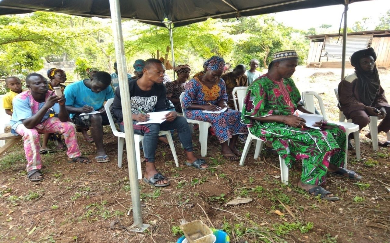 Der Experte (in grau) der Abteilung für Wildtiere und Ökotourismus erklärt Bauern und Bäuerinnen, wie Hasen gehalten werden. © FRIN/Titilope Olarewaju