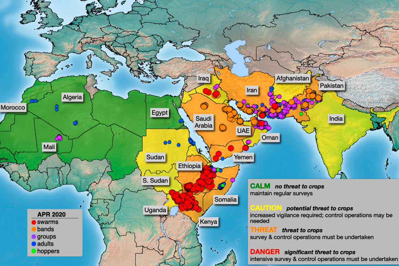 Recently, the climatic event of the ‘Indian Ocean Drop’ (IOD) has been happening more frequently, causing high humidity and flooding. Along with the war and the collapse of governmental functions in Yemen, it gave rise to an unusually large locust population in 2018, which was able to spread for a long time without countermeasures. By June 2019, it managed to spread all the way to East Africa and was again able to multiply massively in that region during the rainy season starting in October 2019
