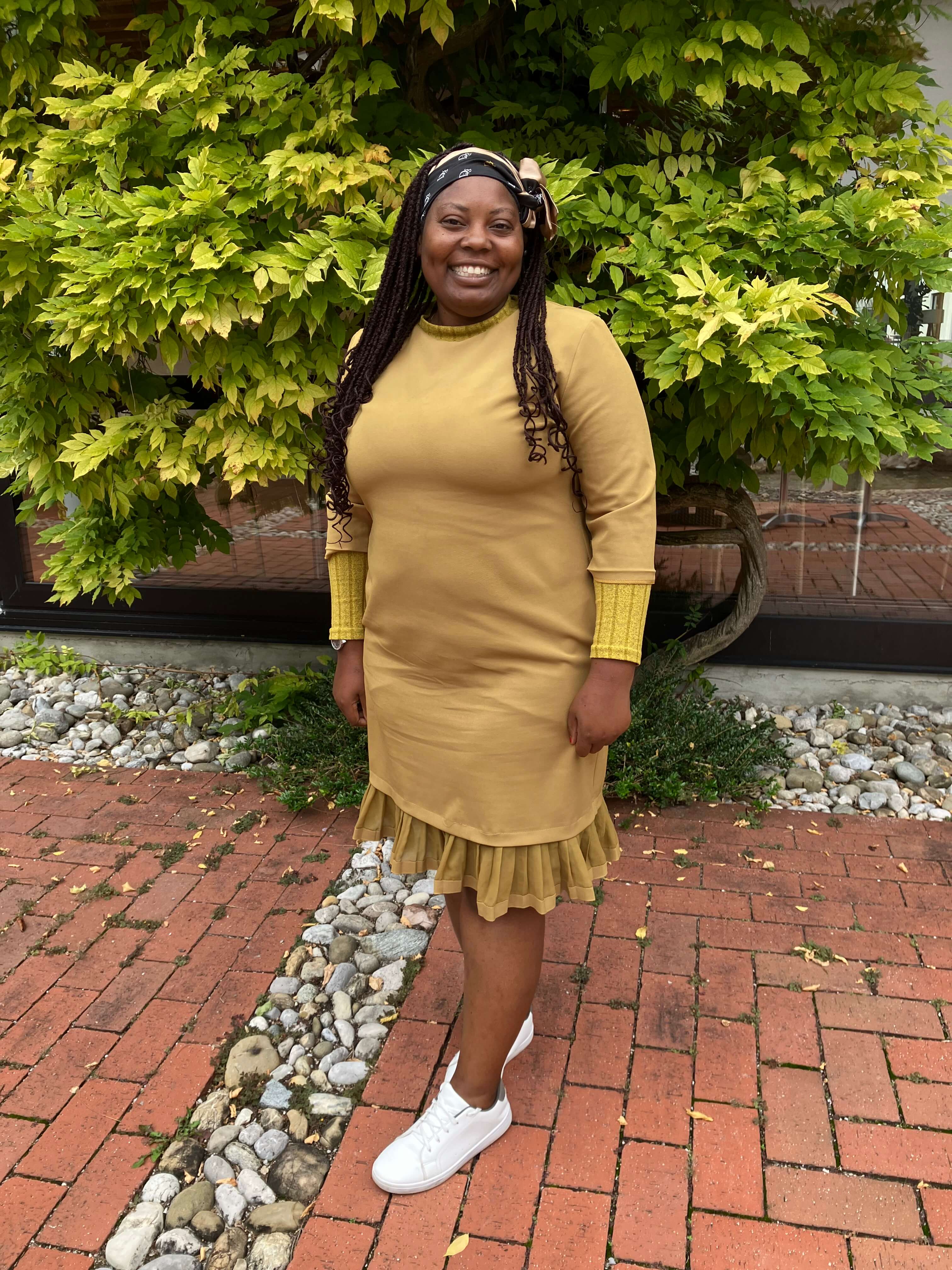 A smiling woman in a vibrant blue patterned outfit stands confidently holding documents, with a group gathered in the background.