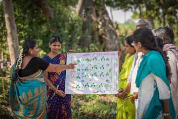 The Farmer Field School (FFS) approach is an innovative example of co-creation of knowledge through horizontal extension, which brings together farmers, researchers and local extensionists. Through FFS, FAO and GEF are enabling small scale farmers to strengthen their resilience by adopting climate change adaptation and agroecological practices. Communities are encouraged to use technologies that are rooted and localized in their current systems and capacities, ensuring long-term ownership and adoption. In Andhra Pradesh, India, the Community Based Natural Farming Programme (APCNF) was created to build resilience to increasingly frequent drought, floods and cyclones experienced in Andhra Pradesh as a result of climate change, while accumulating carbon in soil and perennial vegetation as well as making more efficient use of water to reverse an alarming lowering of the water table.