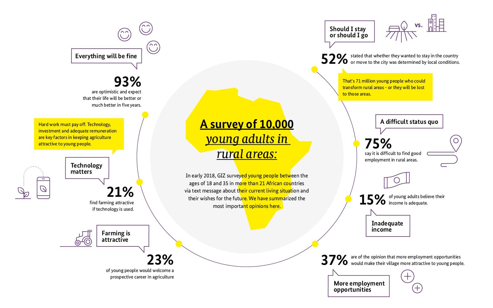10,000 young adults in rural areas in sub-Saharan Africa were surveyed by the Deutsche Gesellschaft für Internationale Zusammenarbeit on their current living situation and their aspirations for career and future. The result: The initial situation in rural areas is difficult, but still attractive - if the framework conditions change for the better!