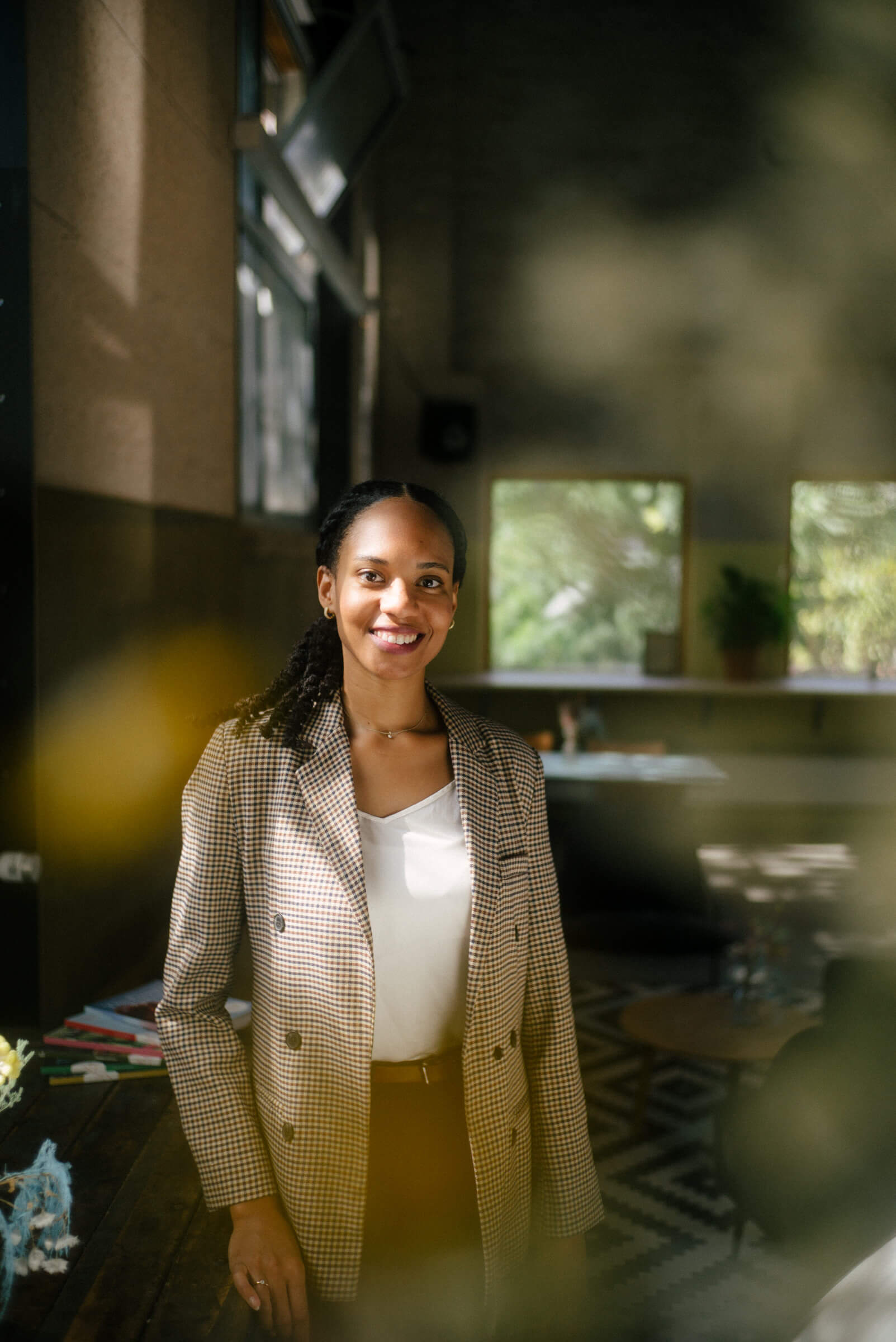 Eine lächelnde Frau im karierten Blazer steht in einem hellen Raum mit großen Fenstern.