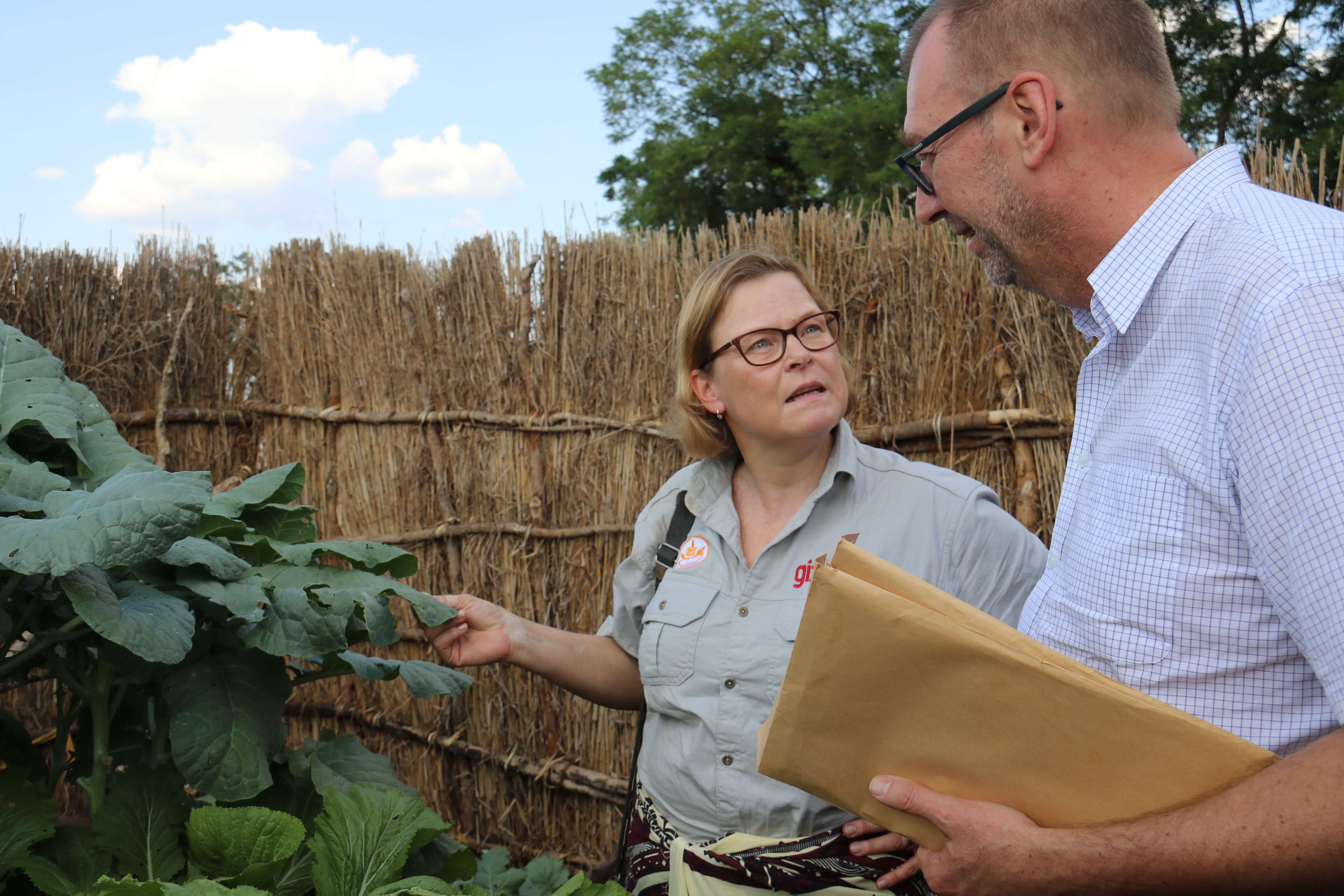 Head of Division of Agriculture and Rural Development within GIZ, Dr Ralf Sanftenberg, with GIZ Country Director Helmut Hauschild on demonstration site for pest management in Eastern Province, Zambia. © Claudia Jordan/GIZ